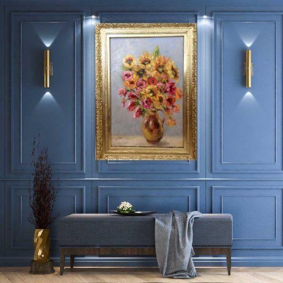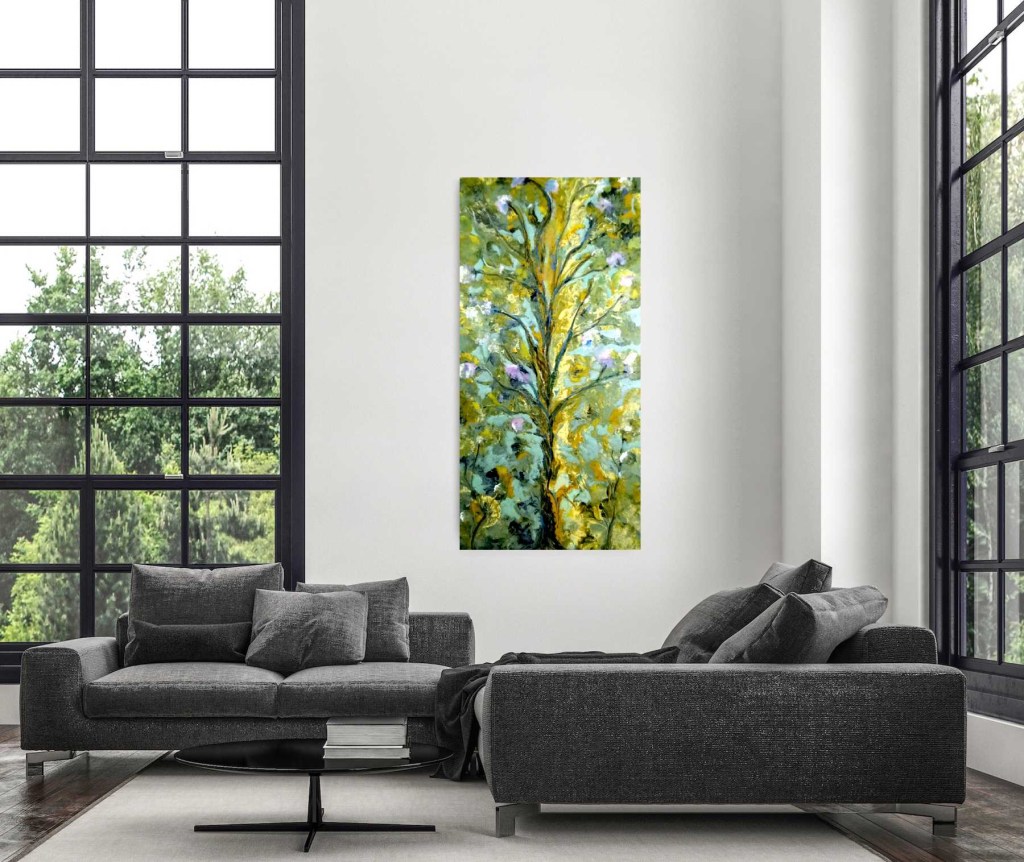 The painting in this post is both oil and acrylic paint on gallery stretched canvas 24×48. Its beautiful from a distance but also exquisitely beautiful in its detail up close.