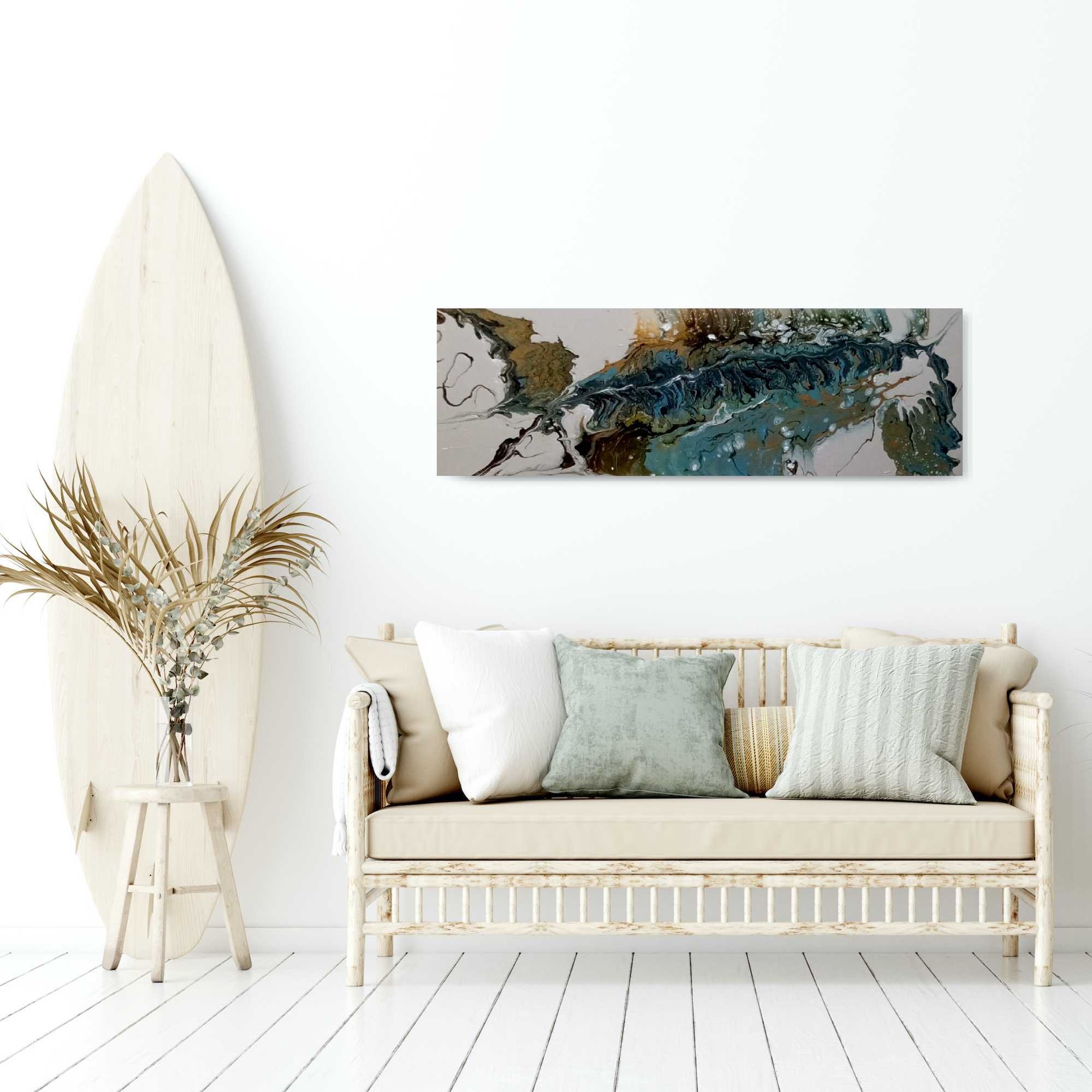 This painting is 36x12x 1, gallery canvas. The work has been protected with high gloss varnish. Edges are finished and hardware is installed for easy use. All paintings come with a certificate of authenticity.